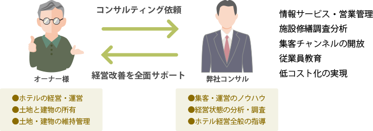 ホテルに対するオーナー様のご意向に基軸を取りながら、弊社の実績あるノウハウをフル活用して 販促・集客・売上・効率・収益の最大化を実現します。