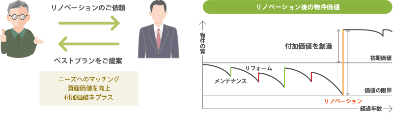 時代性(顧客ニーズ)・地域性・利便性・デザイン性・機能性などを、弊社ノウハウで集中改革し、 資産価値を向上させることで高稼働率、高収益を獲得する事が可能になります。